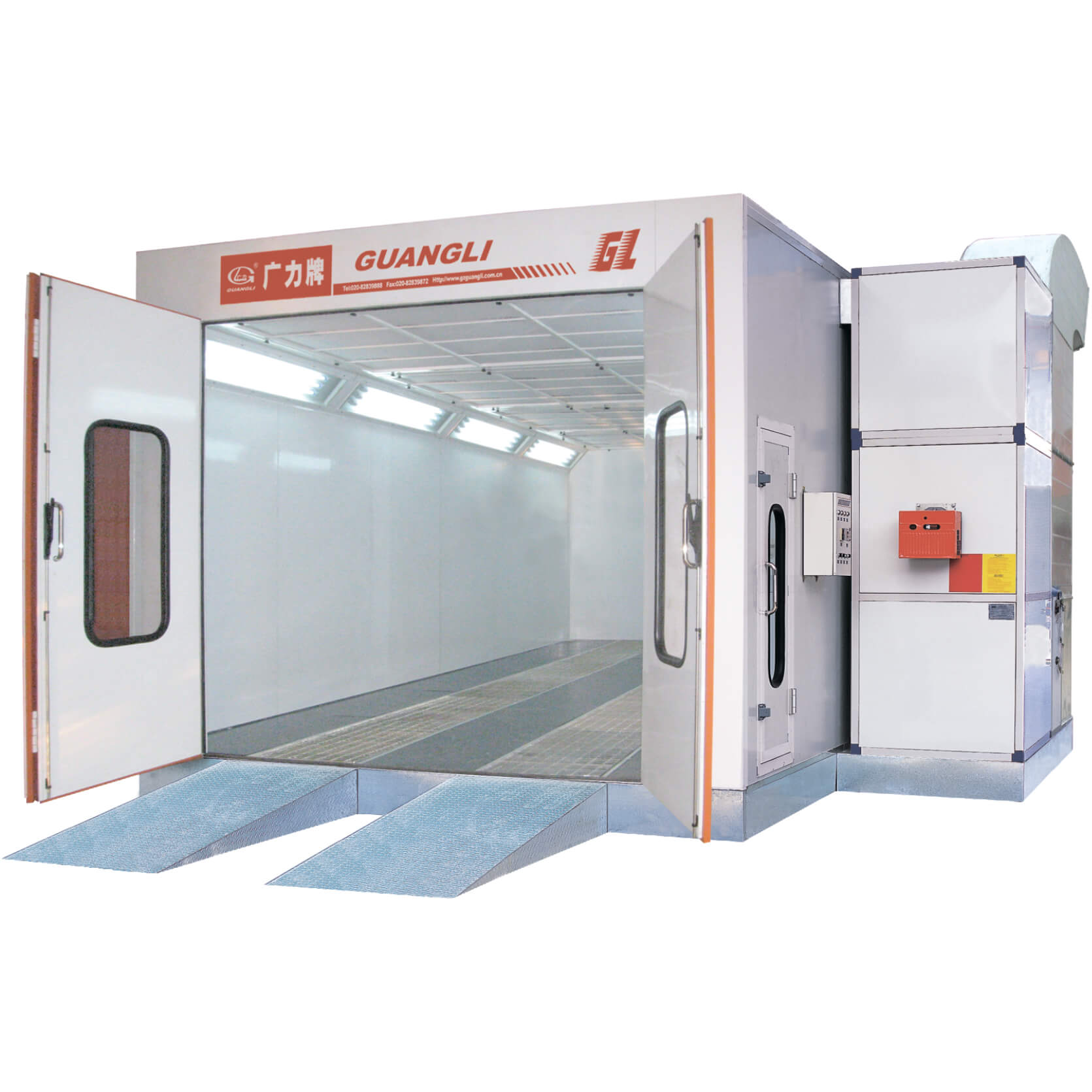 Окрасочно-сушильная камера Guangli GL2 имеет в своей основе металлическое основание высотой 30 см. Напольные решётки выдерживает нагрузку до 600 кг на одно колесо. В стандартном исполнении камера Guangli GL2 комплектуется дизельной горелкой Riello G20 итальянского производства. Мощность горелки составляет 202 кВт, 90 % нагретого воздуха подвергается рециркуляции. Корпус камеры собирается из сэндвич-панелей толщиной 50 мм. В качестве наполнителя используется пенополистирол, опционально можно в качестве наполнителя использовать минеральную вату. Фронтальная дверь покрасочной камеры состоит из 3-х створок, аварийная дверь находится сбоку камеры, она оборудована замком «Антипаника».