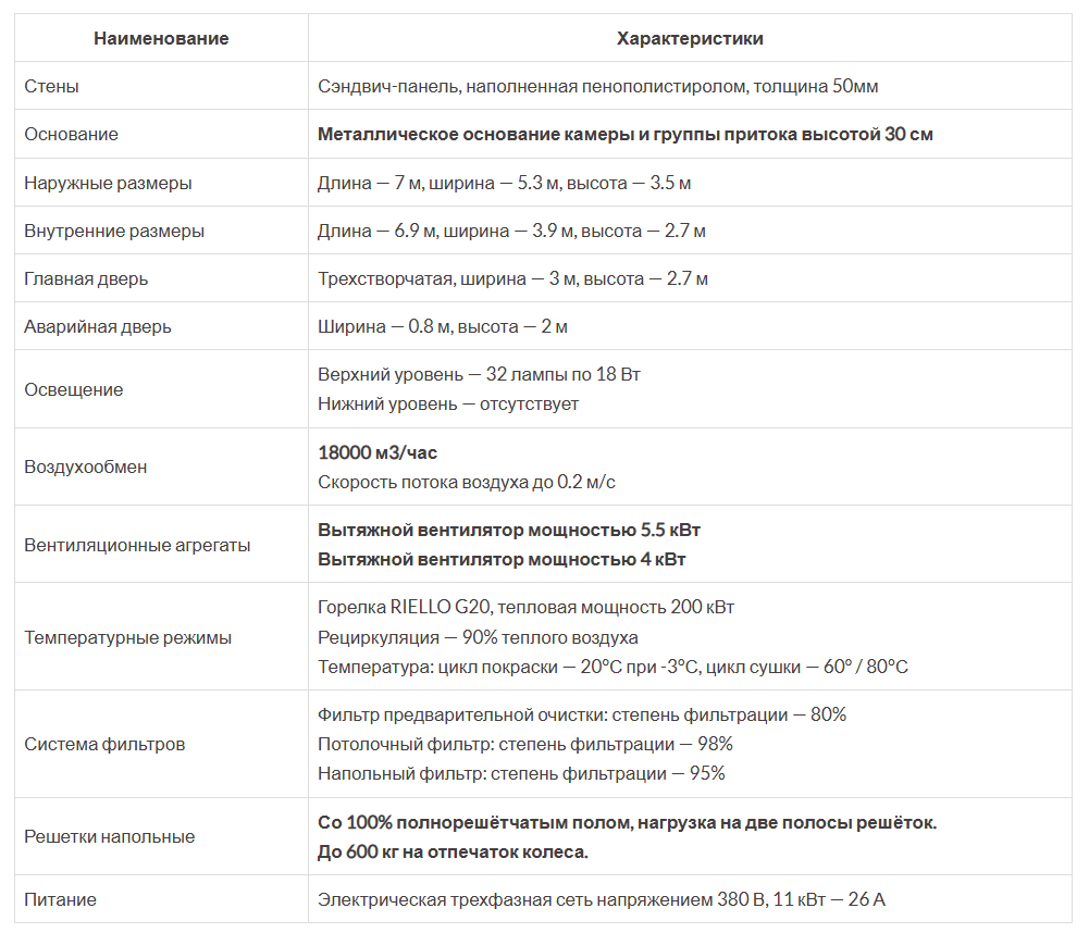 Блок управления и его компоненты импортного производства, они защищены от перегрузки, перегрева и пропадания фазы, мотор с линейным приводом. При истечении заданных значений времени, работа камеры автоматически прекращается. Покраска происходит при постоянной температуре. Питание камеры осуществляется посредством трёхфазной сети с напряжением 380 В, мощность установки 11 кВт.